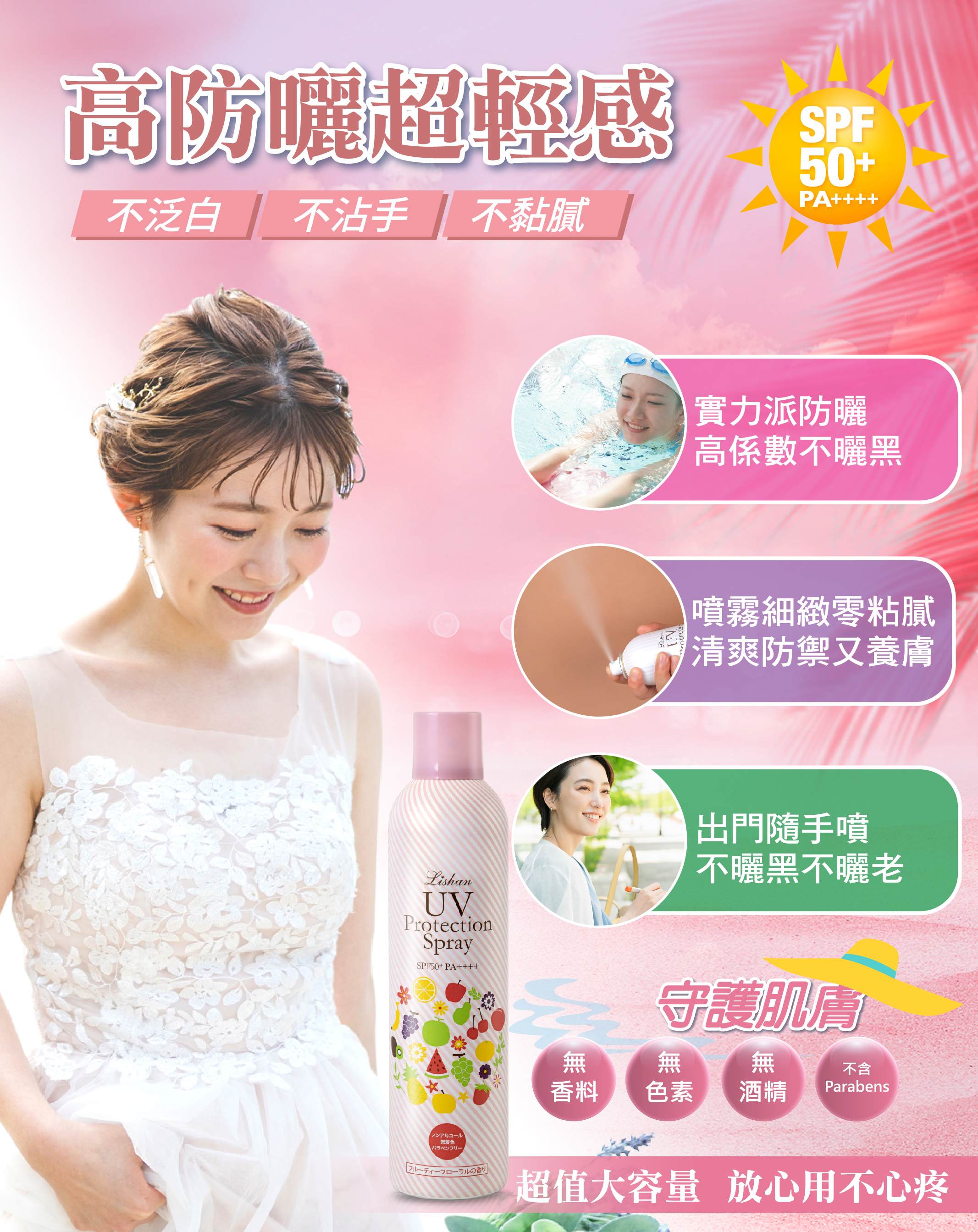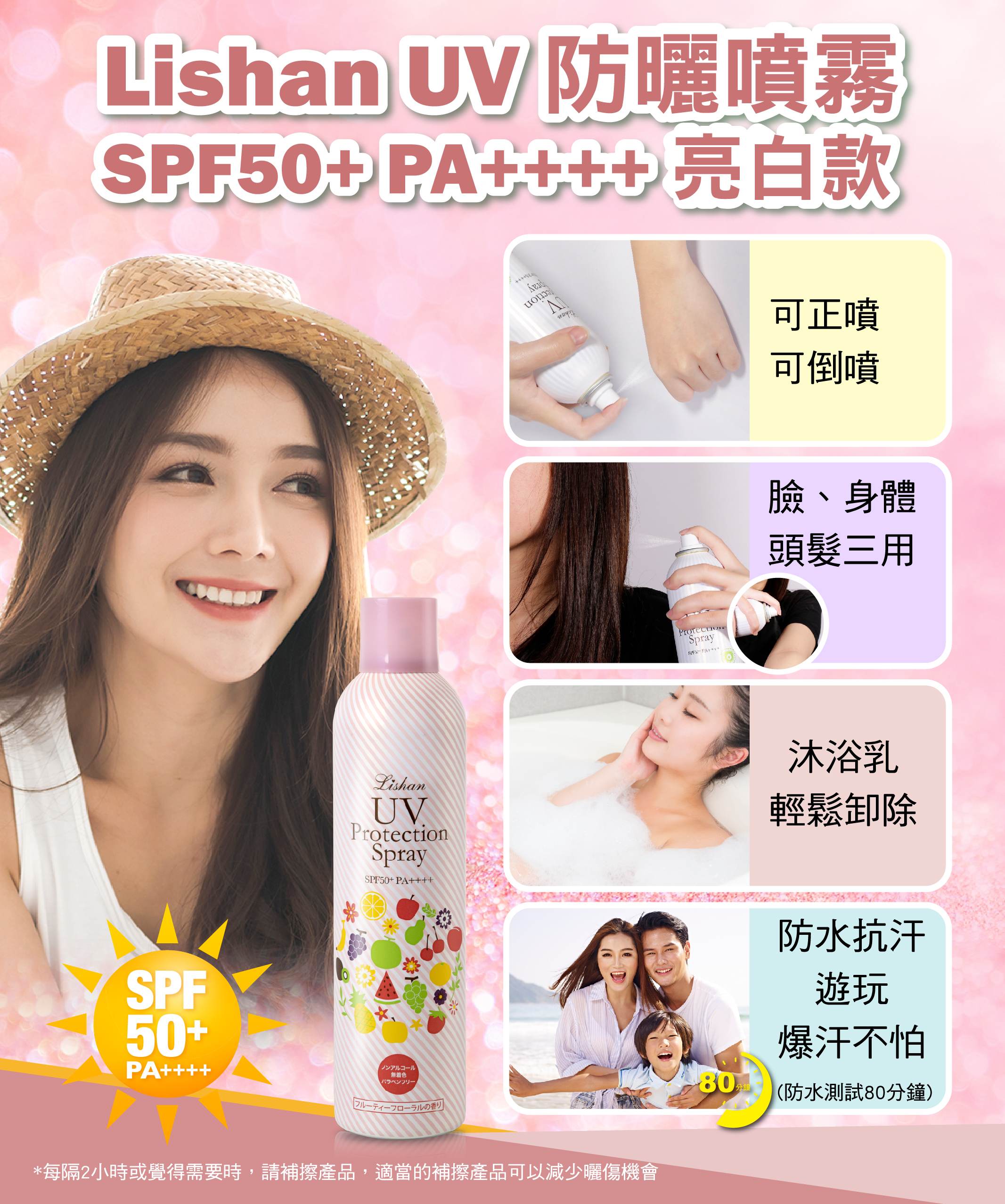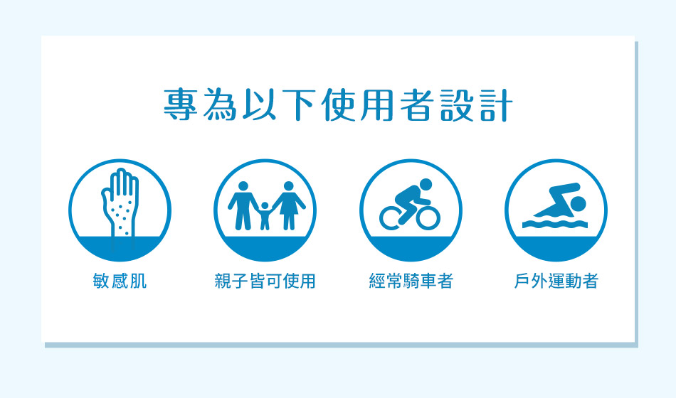 3.為確保防曬效果,於長時間曝曬陽光下時,請每隔2~3小時重新塗抹,並請先將肌膚上之汗水等拭淨。