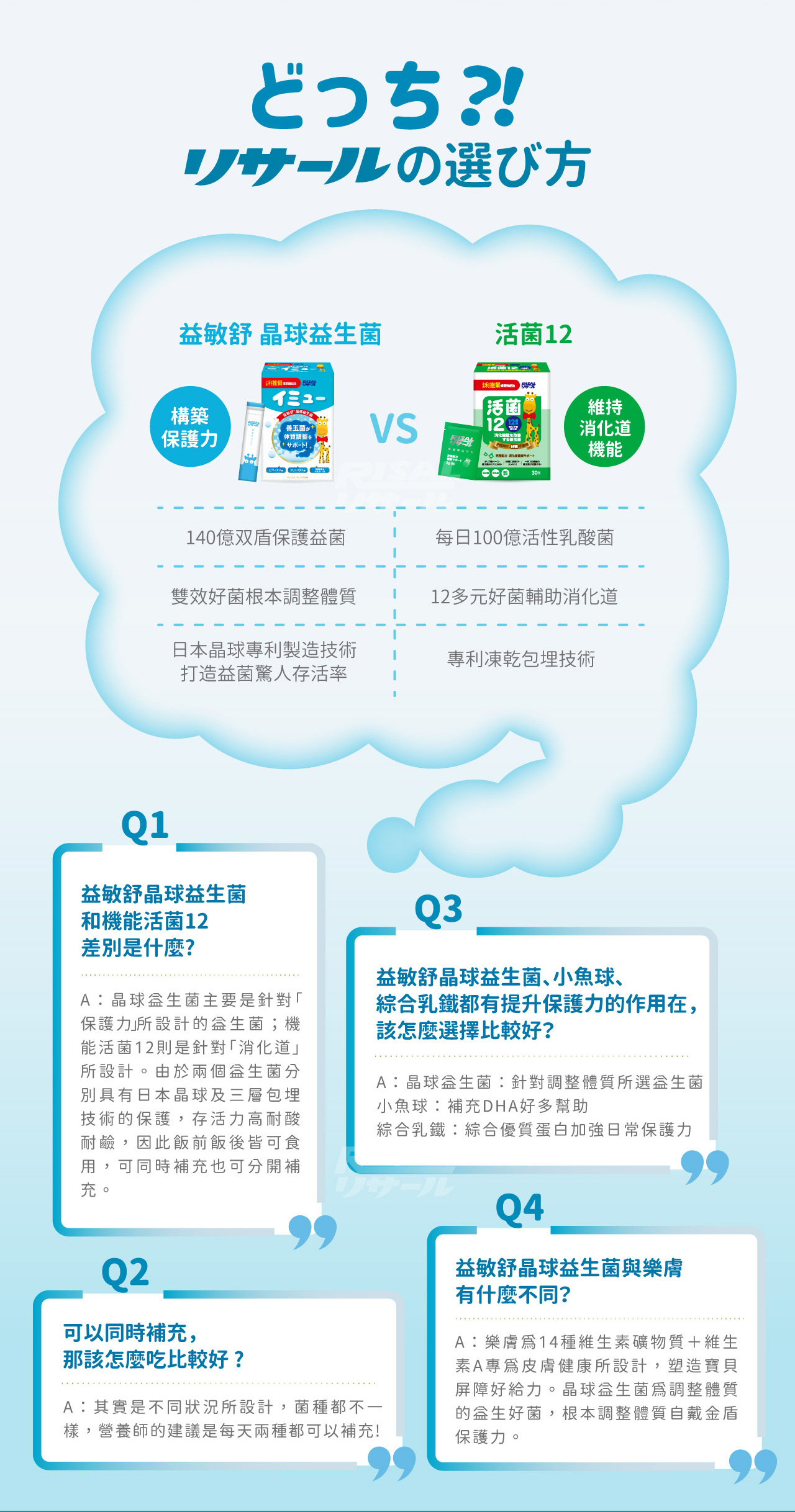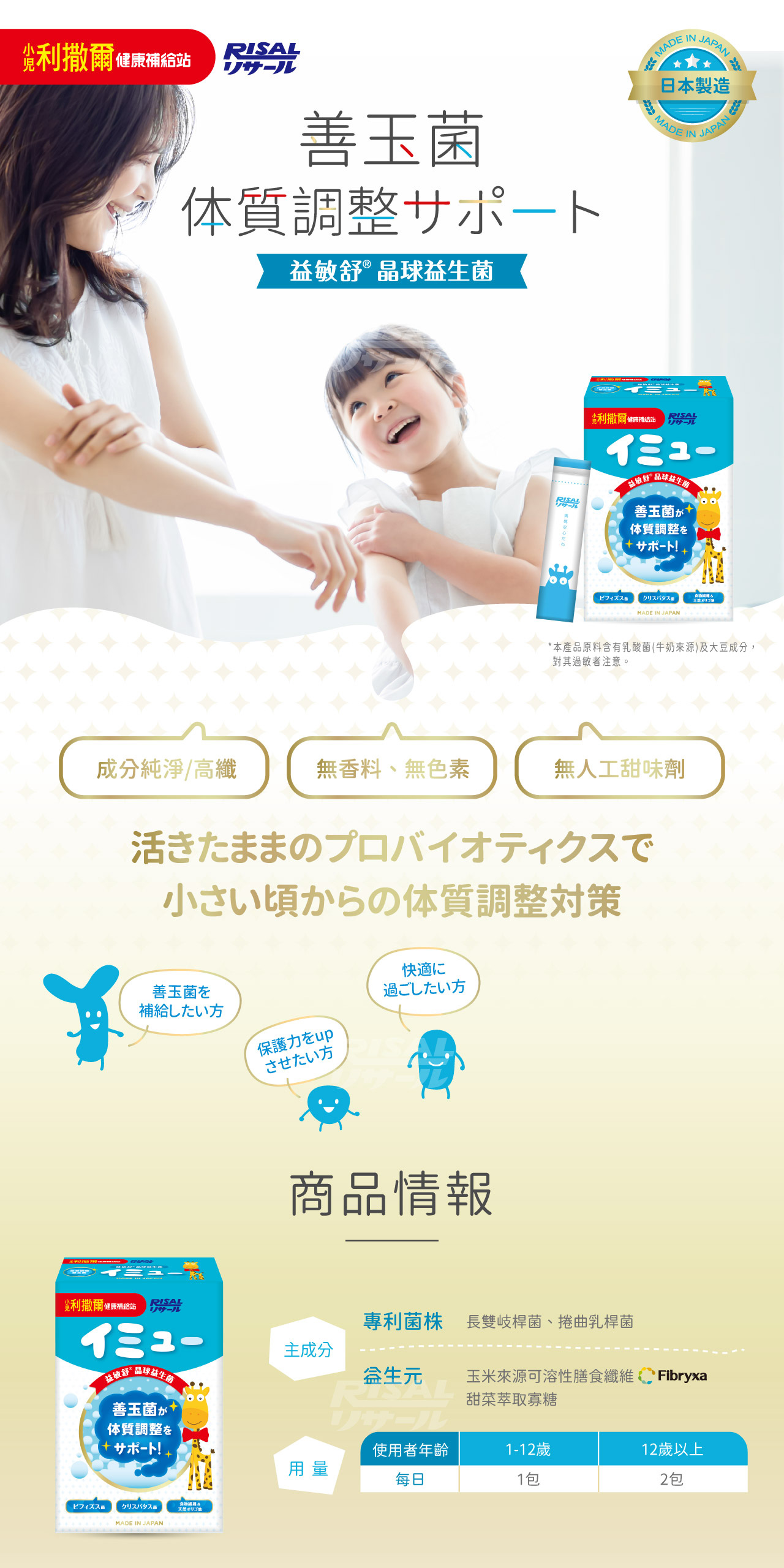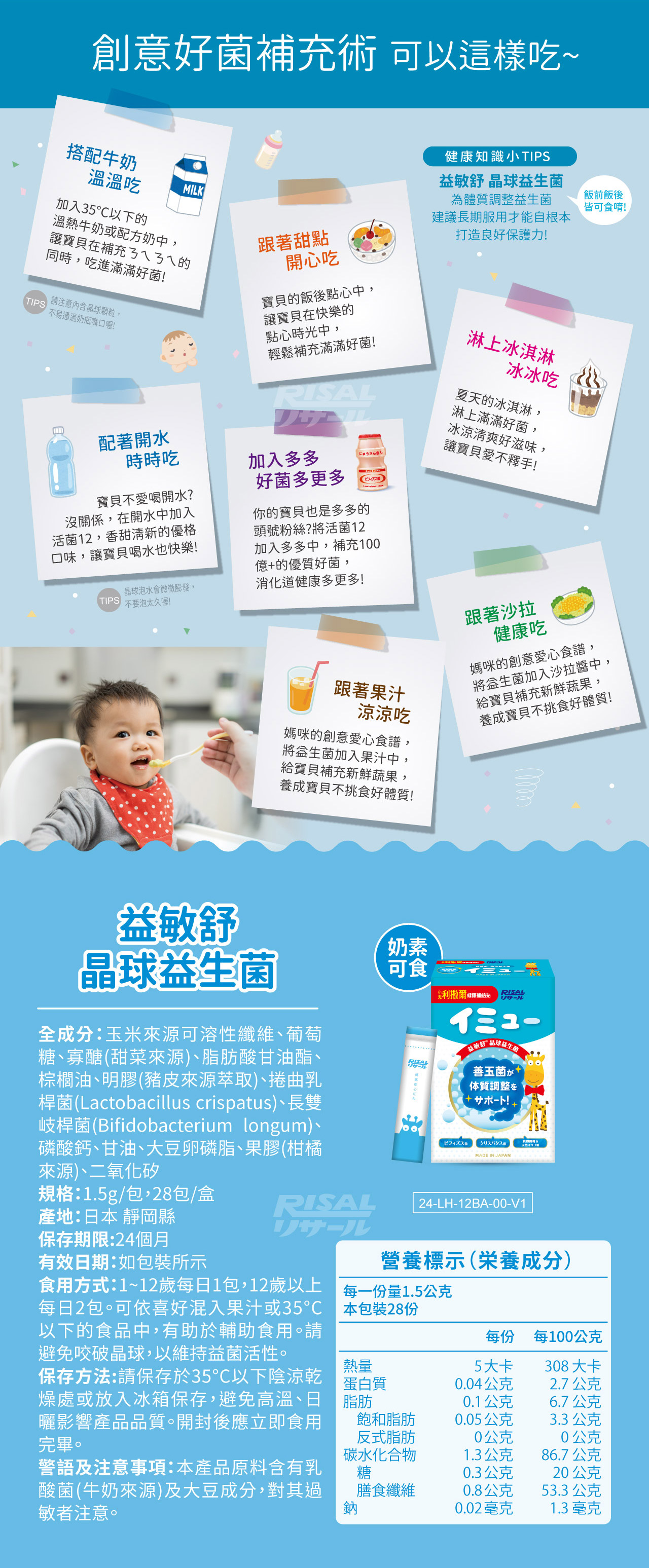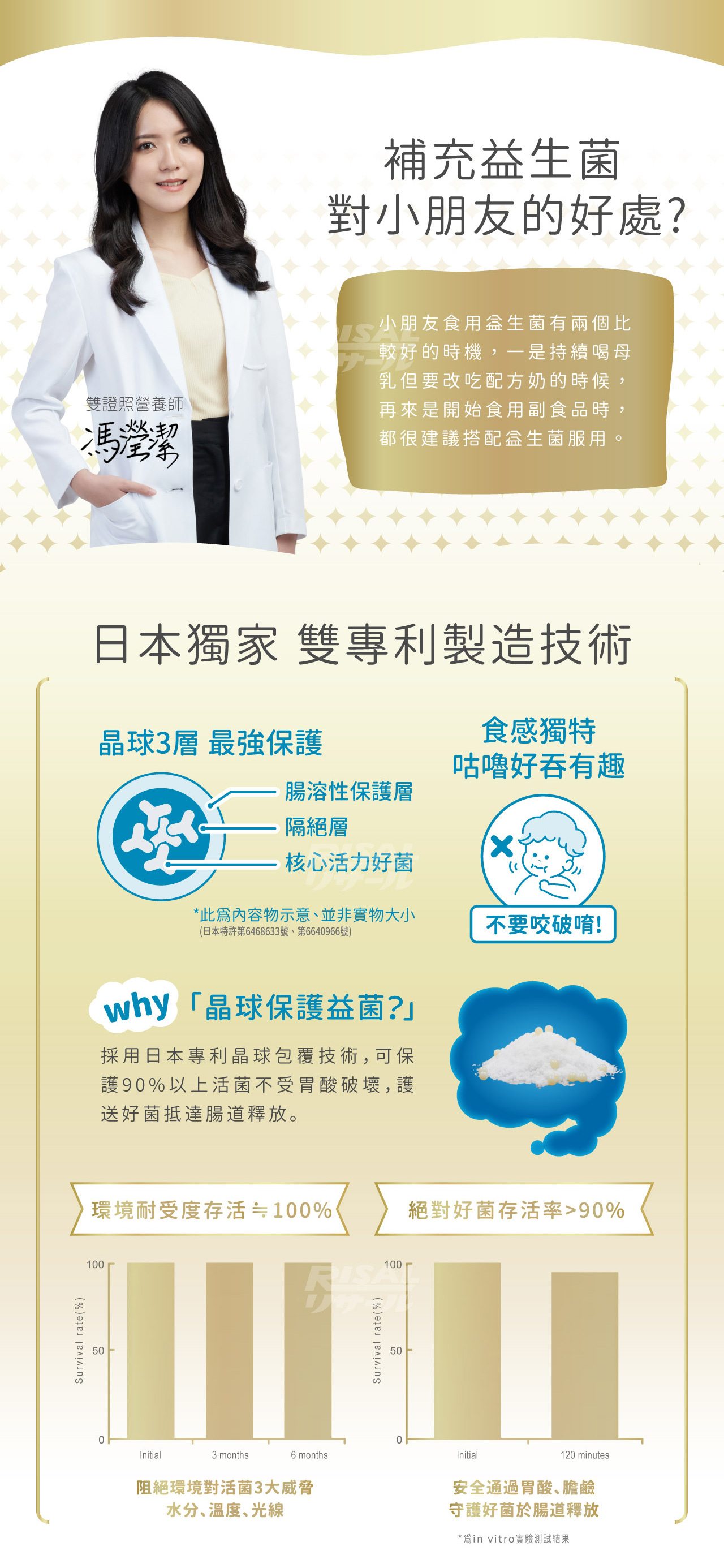食用方法 1到12歲每日1包,12歲以上每日2包,食用後請多喝開水。可依喜好混入果汁或35゚C以下的食品中,有助於輔助食用。請避免咬破晶球,以維持益菌活性。
