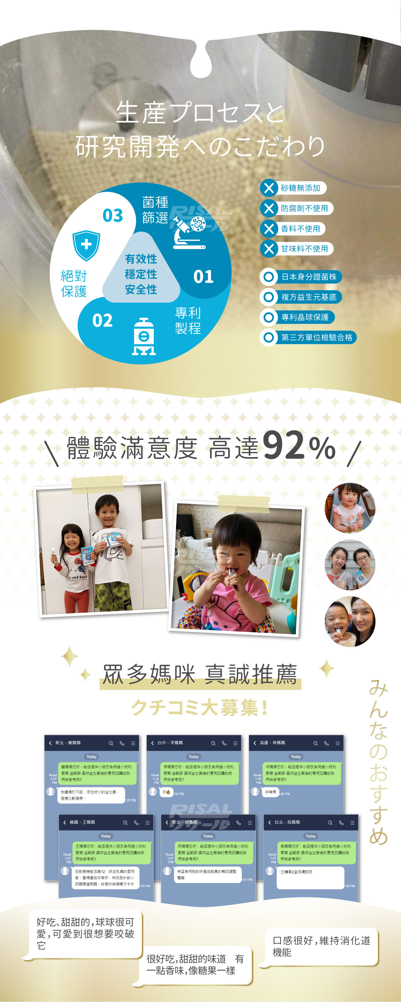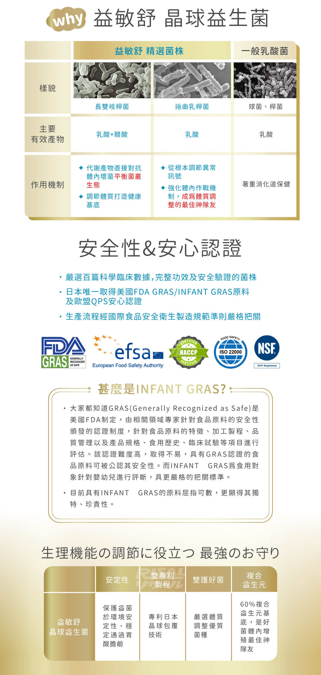 主成分 玉米來源可溶性纖維、葡萄糖、寡醣甜菜來源、脂肪酸甘油酯、棕櫚油、明膠豬皮來源萃取、捲曲乳桿菌(Lactobacillus crispatus)、長雙岐桿菌(Bifidobacterium longum)、磷酸鈣、甘油、大豆卵磷脂、果膠柑橘來源、二氧化矽
