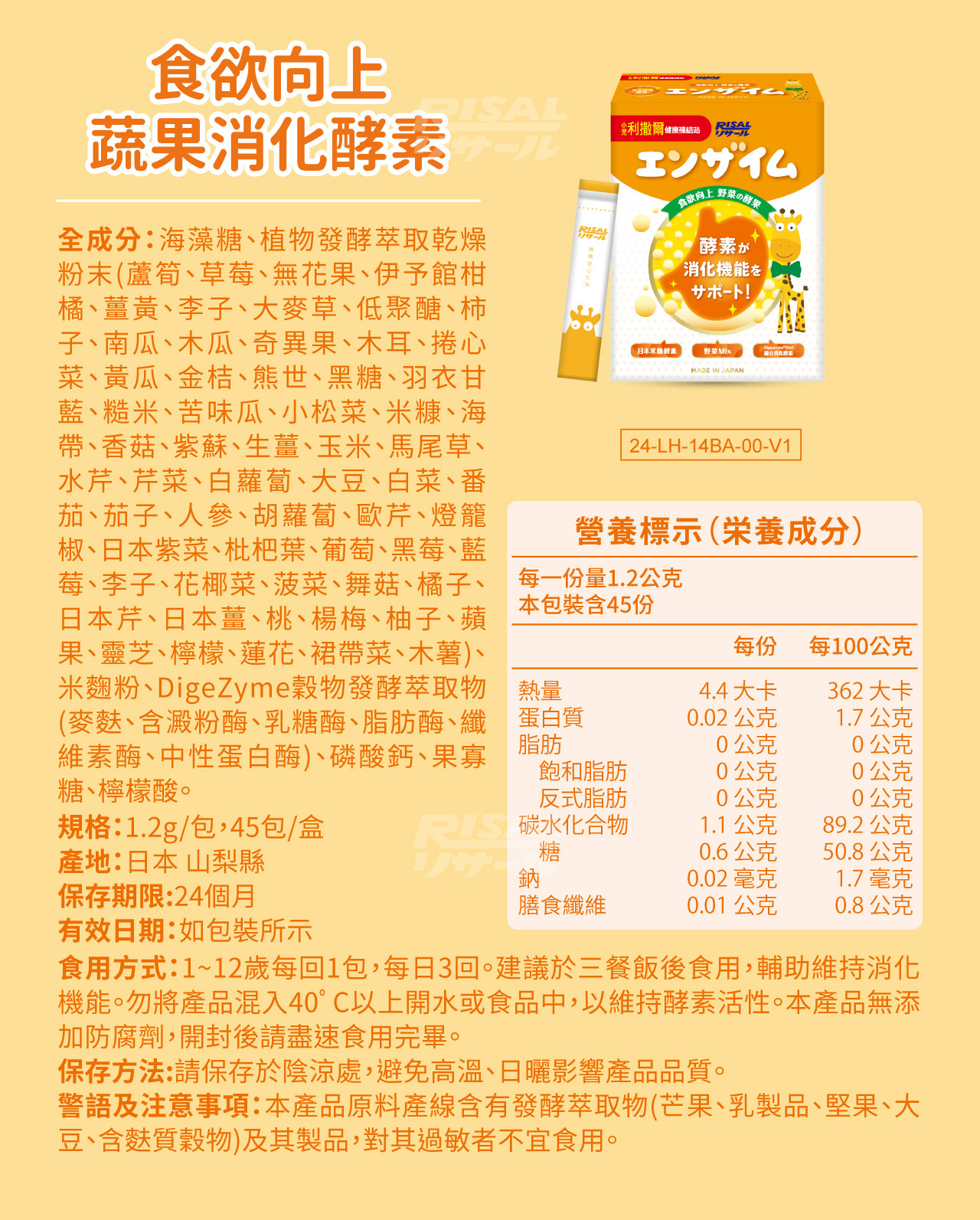 食用方法:1到12歲每回1包,每日3回。建議於三餐飯後食用,輔助維持消化機能。本產品無添加防腐劑,開封後請盡速食用完畢。勿將產品混入40゚C以上開水或食品中,以維持酵素活性。