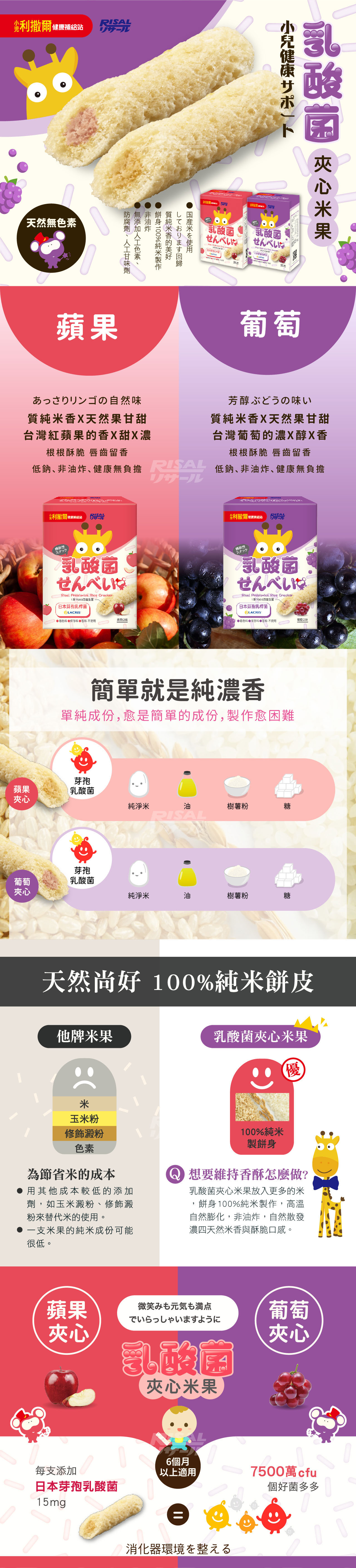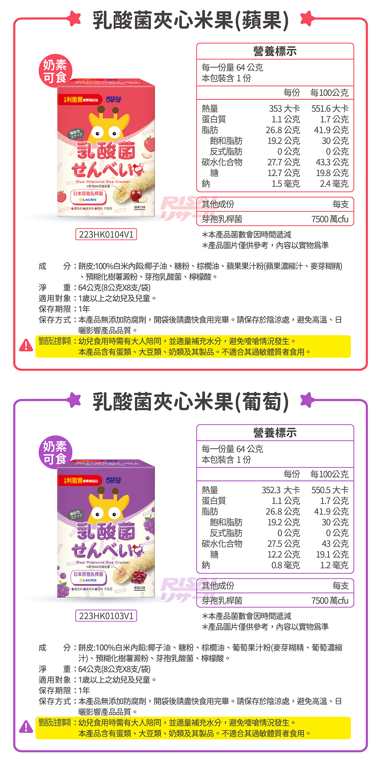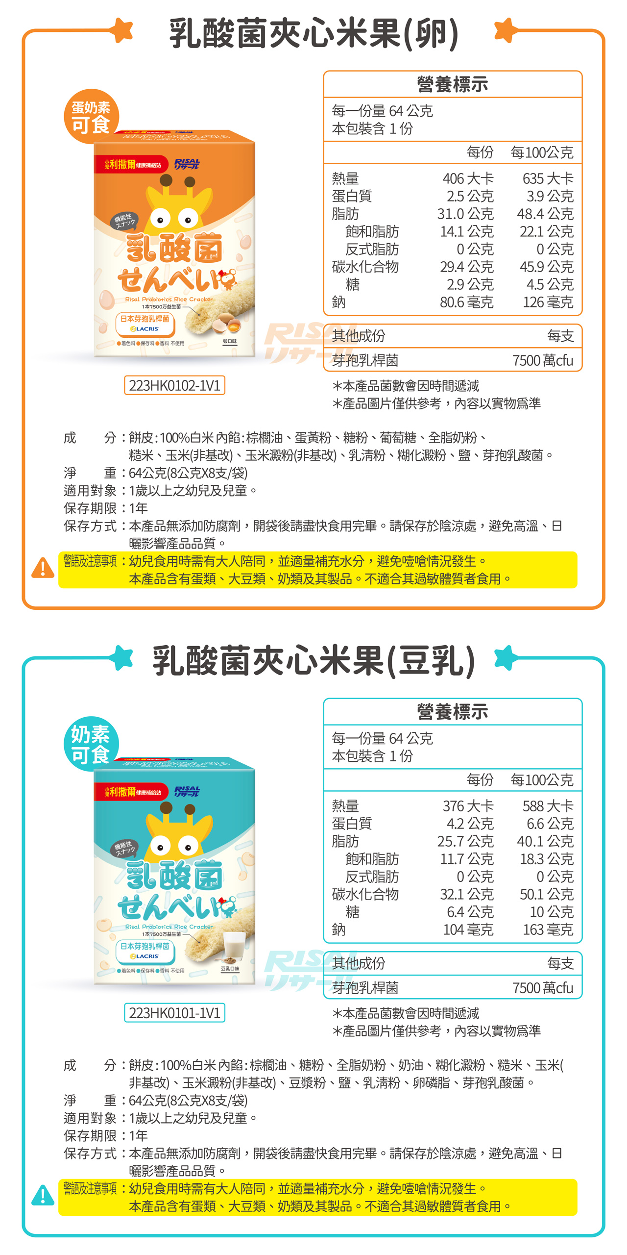 主成份:白米(100%)、棕櫚油、蛋黃粉、糖粉、葡萄糖、全脂奶粉、糙米、玉米非基改、玉米澱粉非基改、乳清粉、糊化澱粉、鹽、芽孢乳酸菌