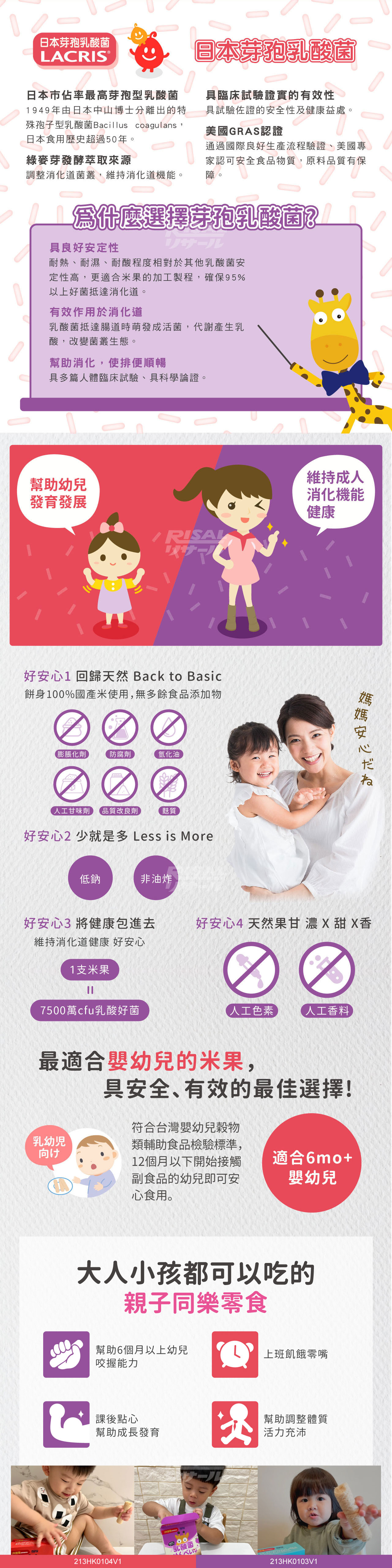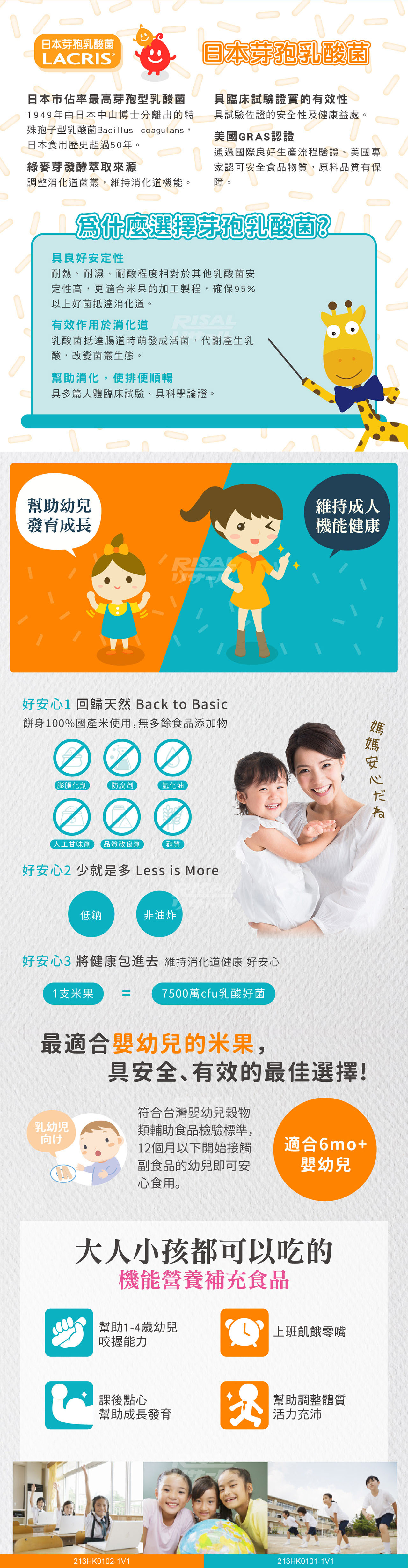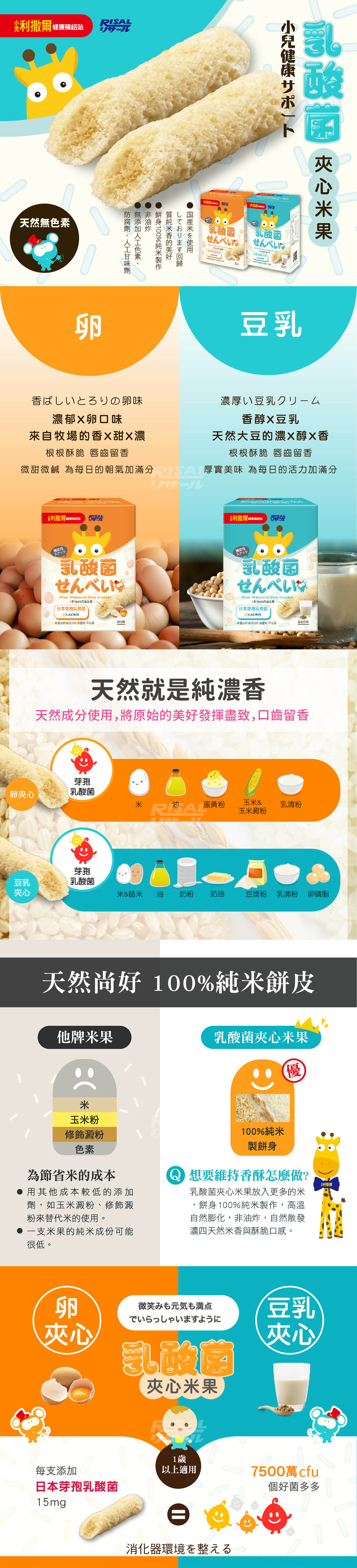 主成份:白米(100%)、棕櫚油、蛋黃粉、糖粉、葡萄糖、全脂奶粉、糙米、玉米非基改、玉米澱粉非基改、乳清粉、糊化澱粉、鹽、芽孢乳酸菌