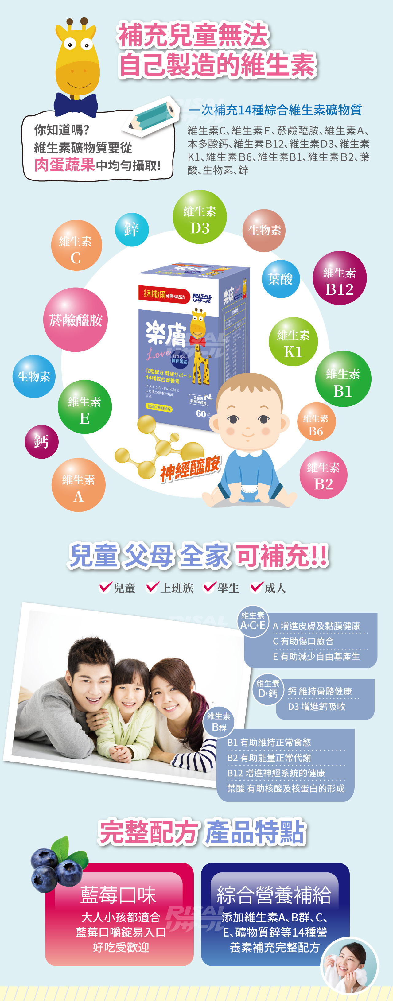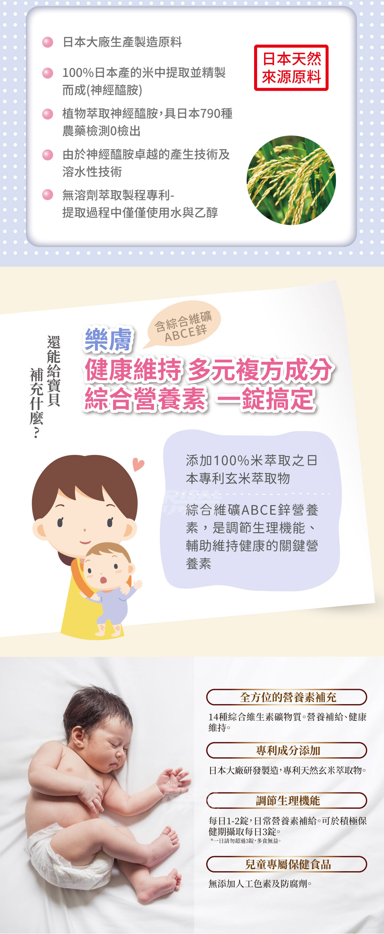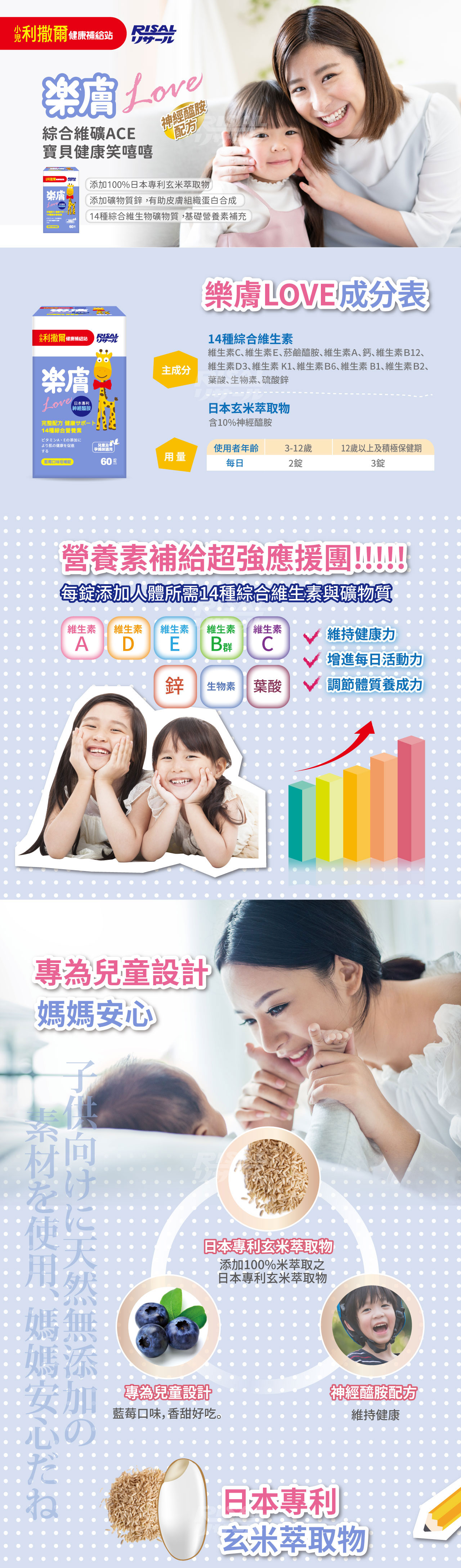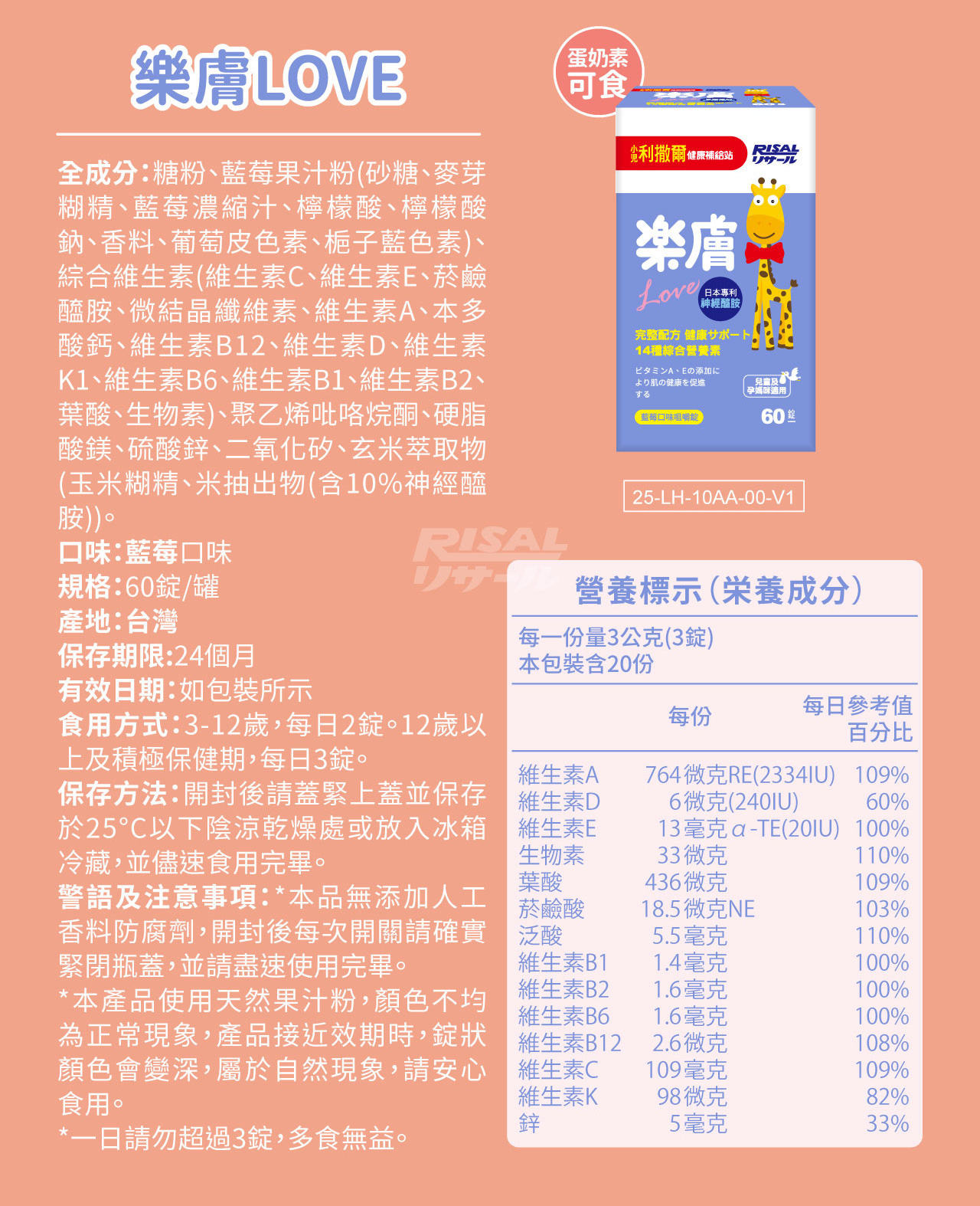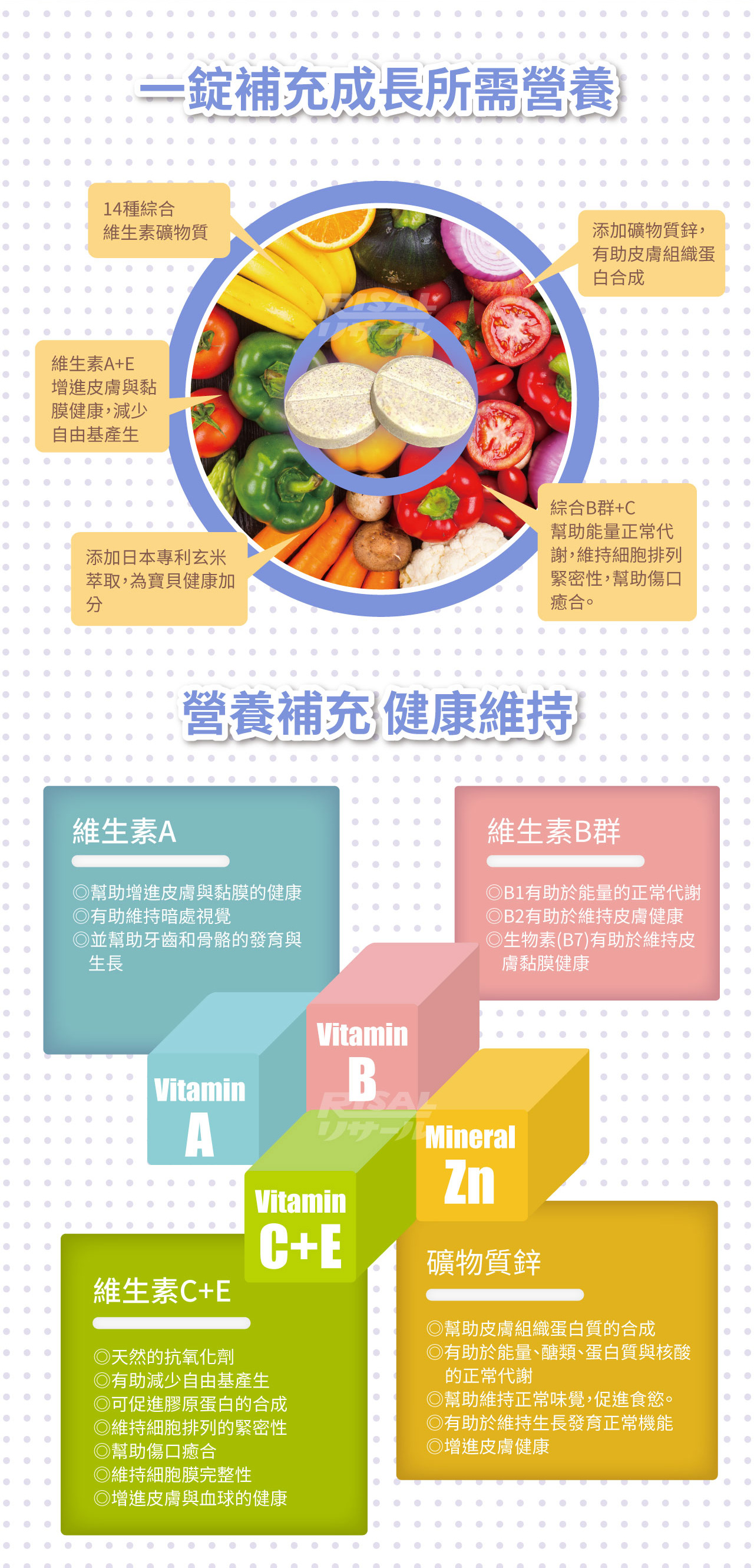 主成分 糖粉、藍莓果汁粉、綜合維生素維生素C、維生素E、菸鹼醯胺、微結晶纖維素、維生素A、本多酸鈣、維生素B12、維生素D、維生素K1、維生素B6、維生素B1、維生素B2、葉酸、生物素、聚乙烯吡咯烷酮、硬脂酸鎂、硫酸鋅、二氧化矽、玄米萃取物玉米糊精、米抽出物含10神經醯胺