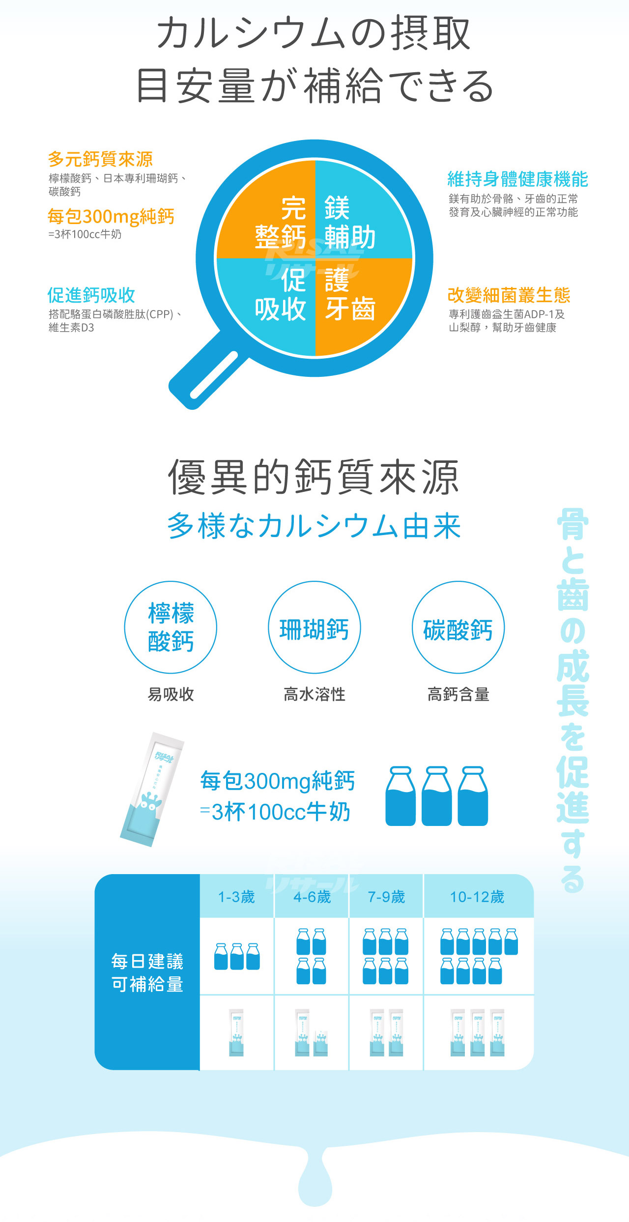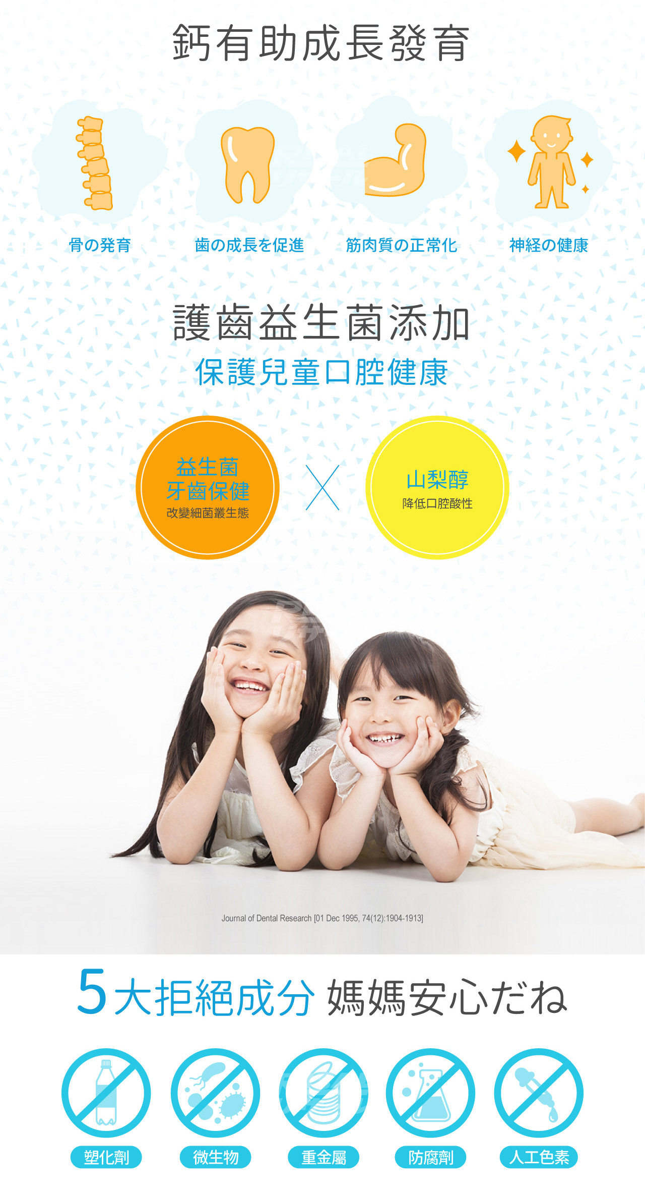 主成分 D山梨醇顆粒D山梨醇、羧甲基纖維素鈉、碳酸鈣顆粒碳酸鈣、澱粉、檸檬酸鈣、氧化鎂、珊瑚鈣、酪蛋白水解物16酪蛋白磷酸胜肽、副乾酪乳桿菌ADP1 L.paracasei、鳳梨香料、維生素D3。