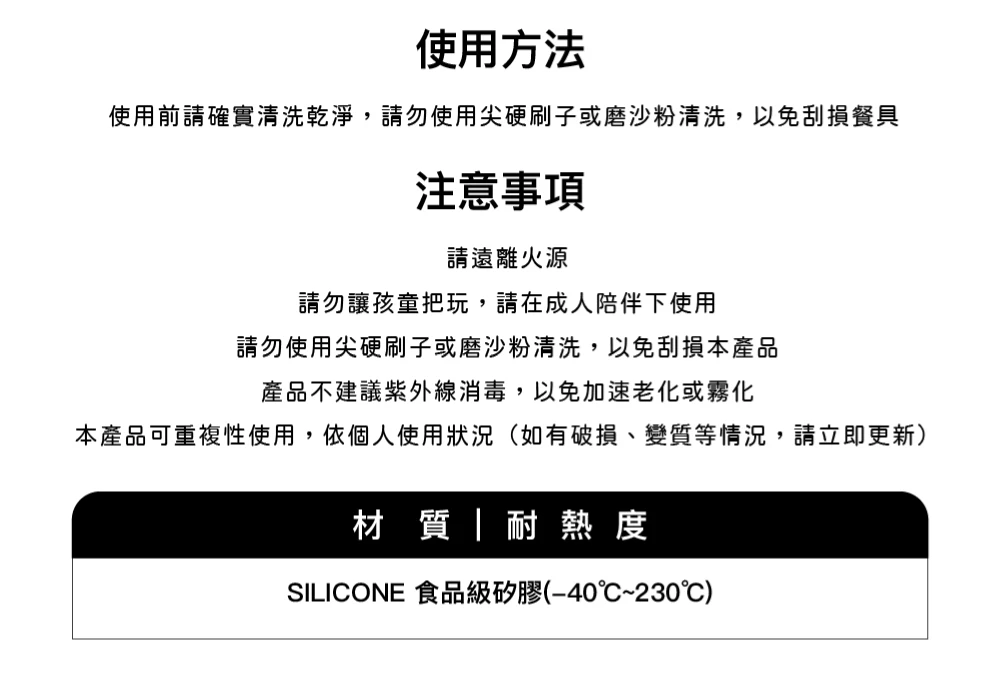 材質/ 耐熱度:SILICONE 食品級矽膠(-40℃~230℃)。