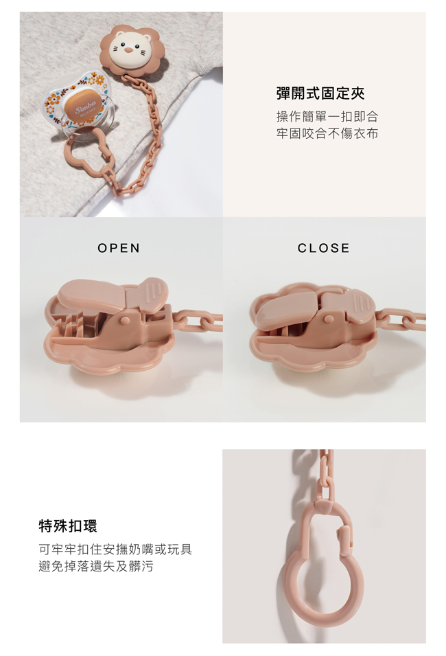 用途:固定安撫奶嘴、固齒器、紗布巾/口水巾固定