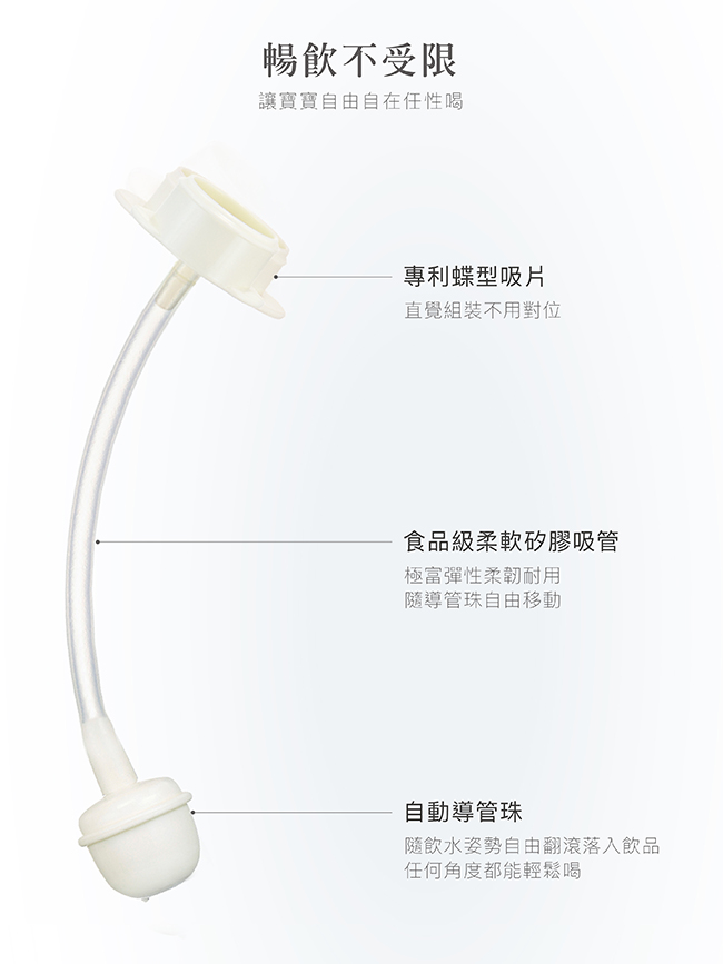 3.嚴選食品級柔軟矽膠自動吸管,不含干擾內分泌化學物質(環境賀爾蒙、雙酚A)。