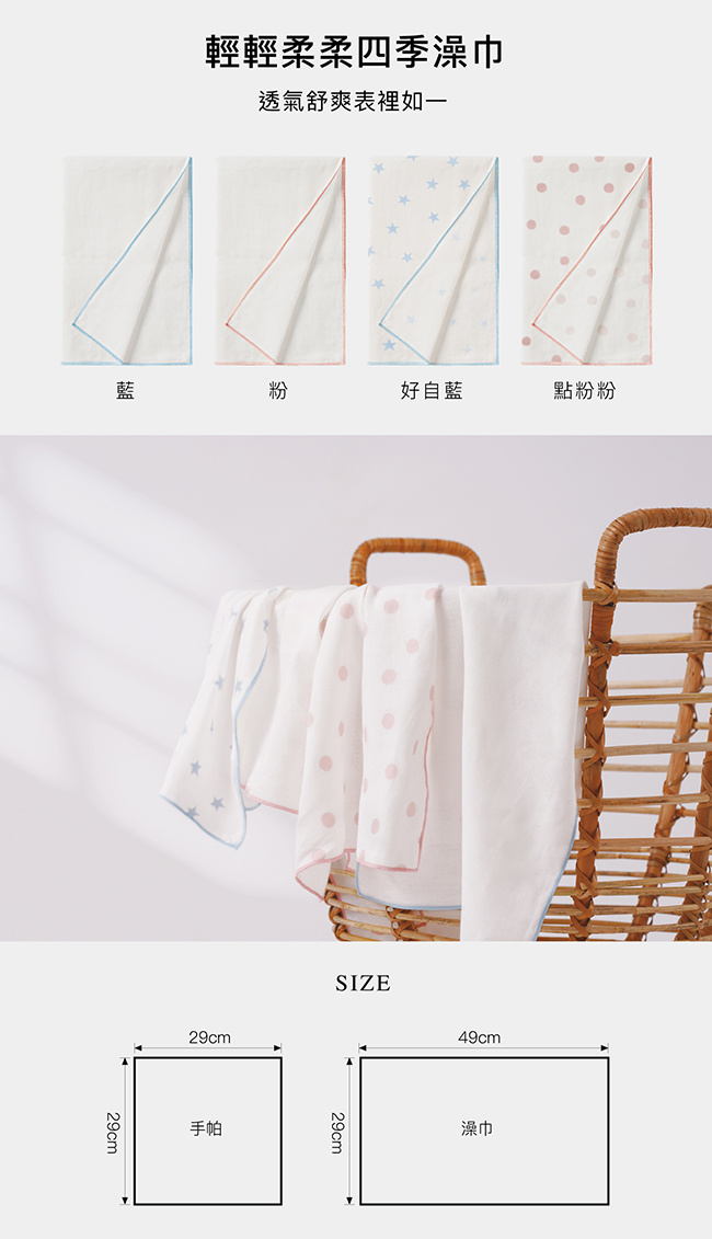 ●尺寸:手帕約29x29cm、澡巾約49x29cm