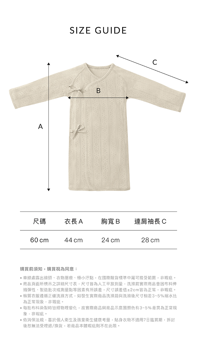 尺碼60cm:衣長約44±2cm/胸寬約24±2cm/連肩袖長約28±2cm
