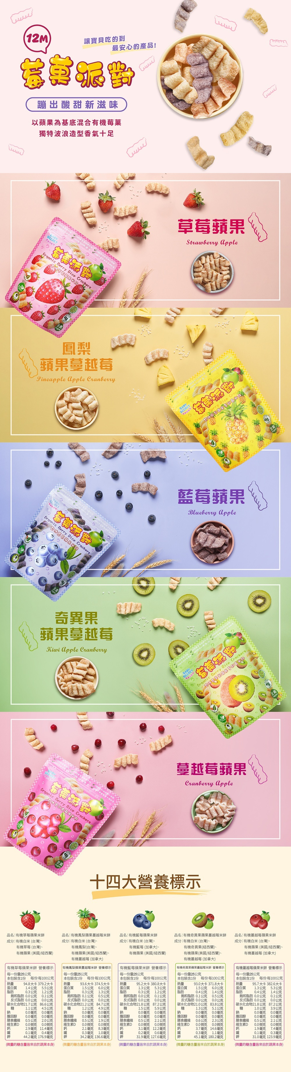 • 內容物成分(如含有豬、牛成分請加註國別):有機白米(台灣)、有機蘋果(美國/紐西蘭)、有機蔓越莓(加拿大)、有機藍莓(加拿大)、有機草莓(台灣)