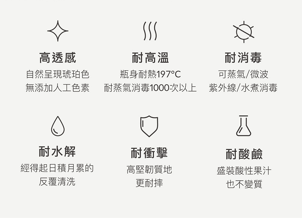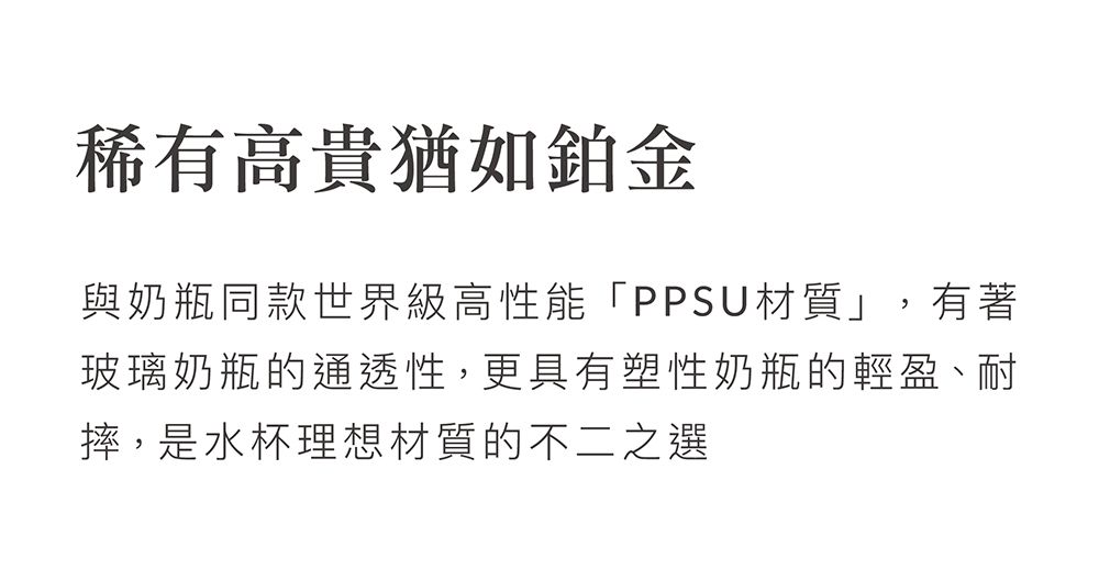 •滑蓋、中蓋把手、吸管接頭:聚丙烯(-20℃~ 100℃)•吸嘴、墊圈、吸管:矽膠(-20℃~ 120℃)•瓶身:聚亞苯基碸(-20℃~ 197℃)•導管珠:聚丙烯‧不鏽鋼(-20℃~ 100℃)