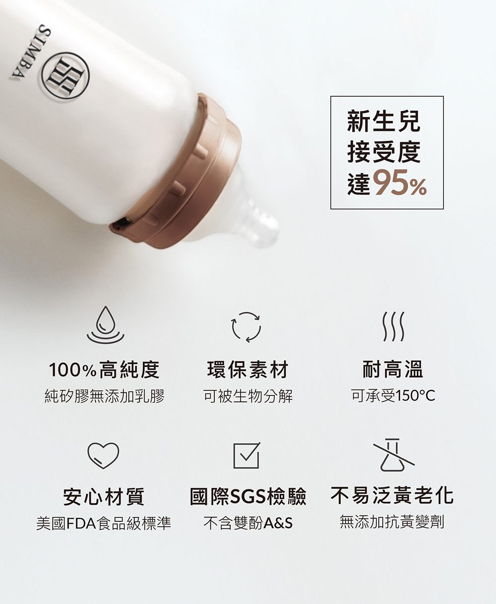 1. 專為新生兒打造食品級白金矽膠奶嘴,擬造媽媽乳房觸感。
