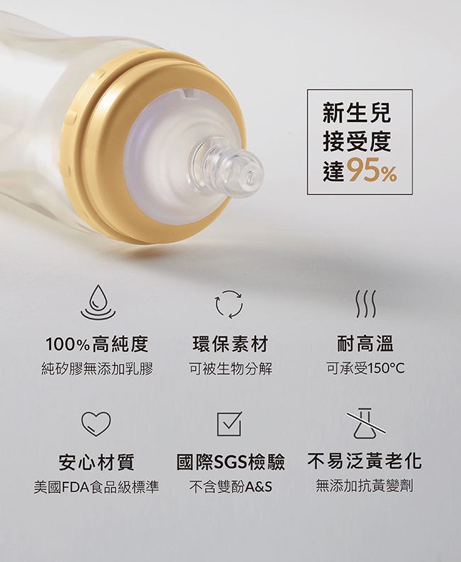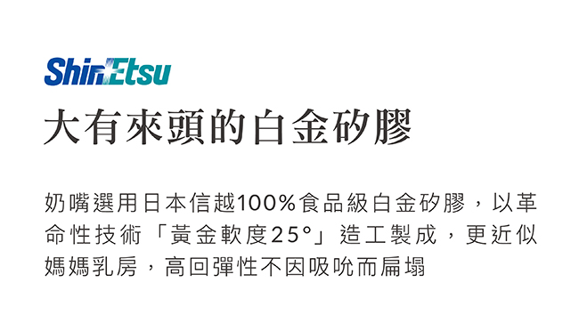 1. 專為新生兒打造食品級白金矽膠奶嘴,擬造媽媽乳房觸感。