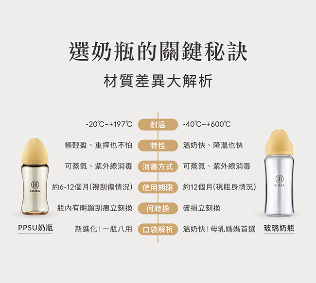 材質:•奶瓶蓋、中蓋:聚丙烯 (-20℃~+100℃) •奶瓶:硼矽酸玻璃 (-40℃~+600℃) •防脹氣奶嘴:矽膠 (-40℃~+150℃)