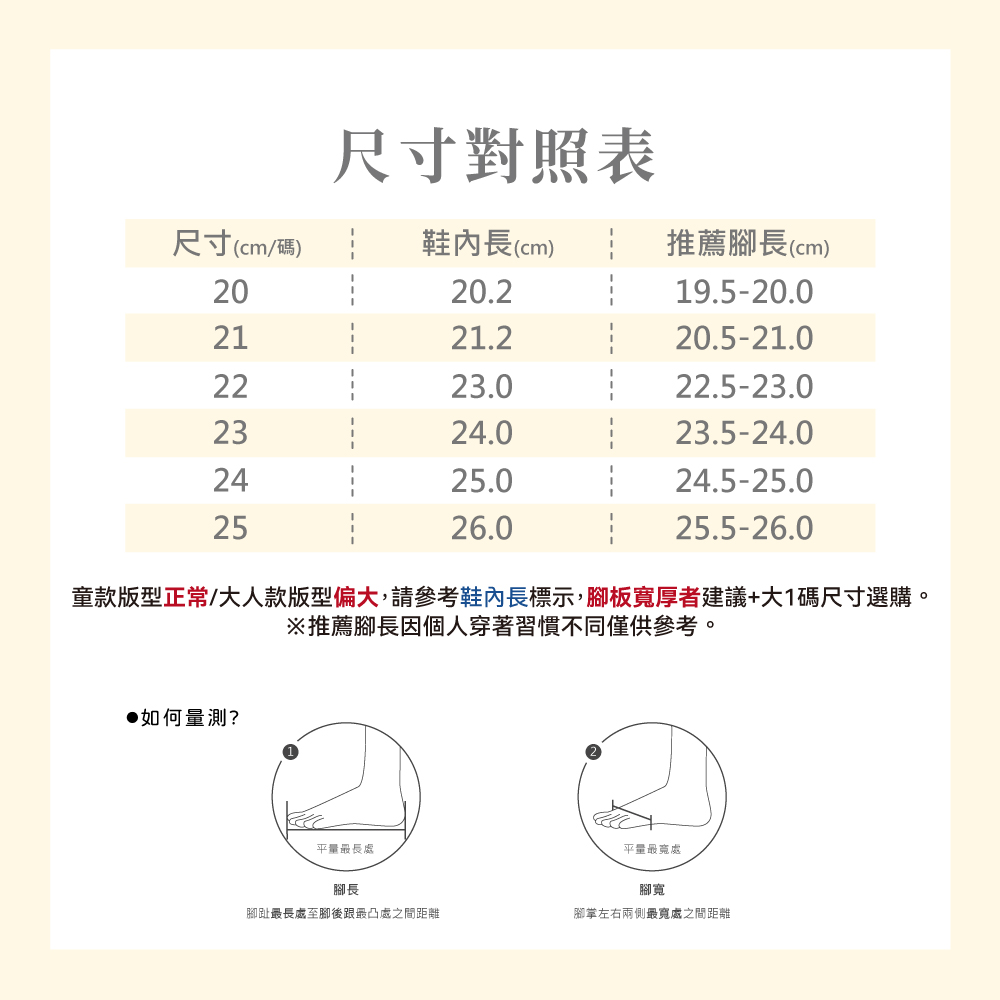 童款版型正常/大人款版型偏大,請參考鞋內長標示﹐腳板寬厚者建議+大1碼尺寸選購 。